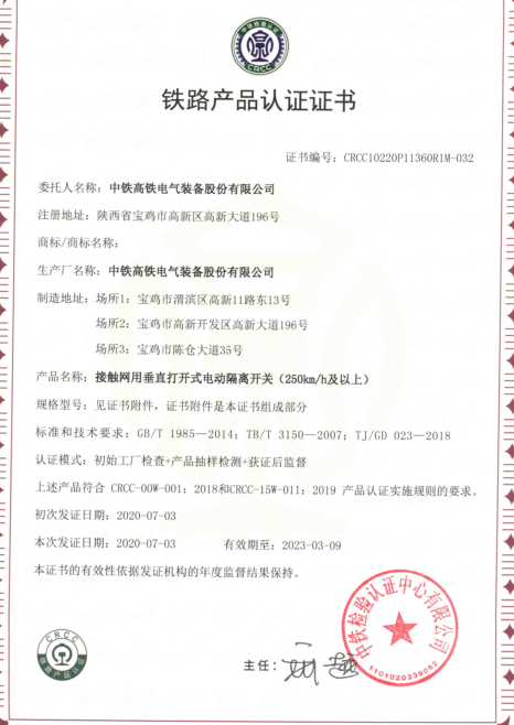 伟德国际victor1946公司喜获电动隔离开关CRCC认证证书