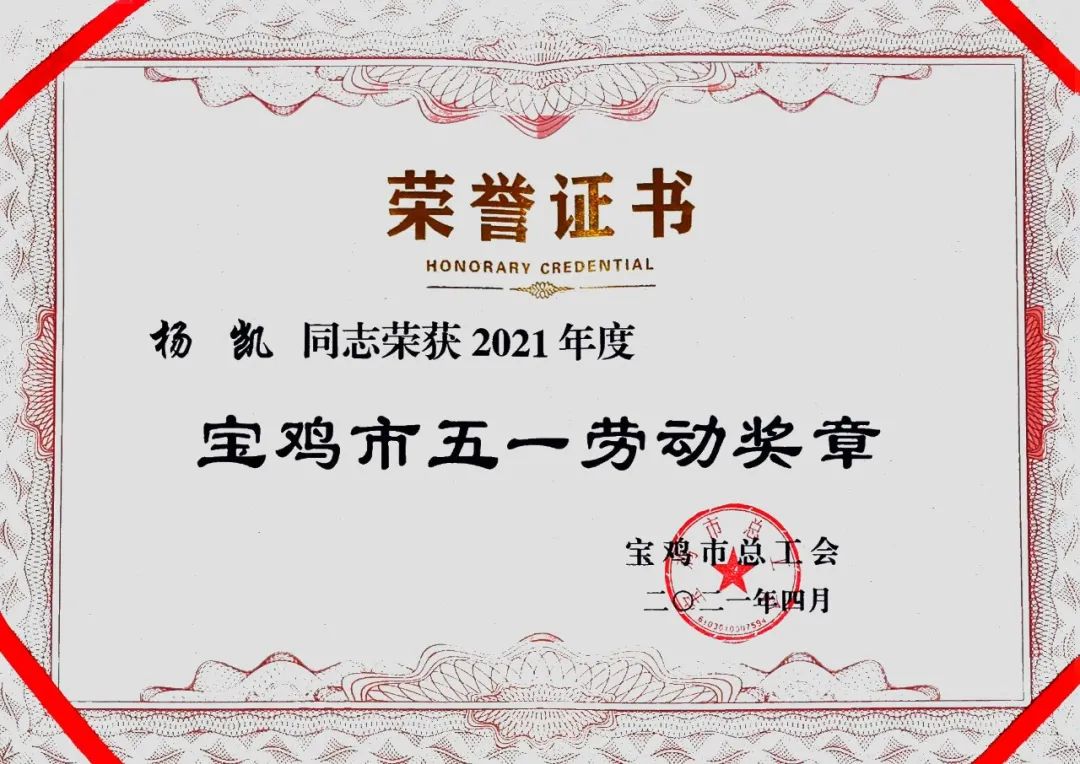 杨凯获宝鸡市五一劳动奖章