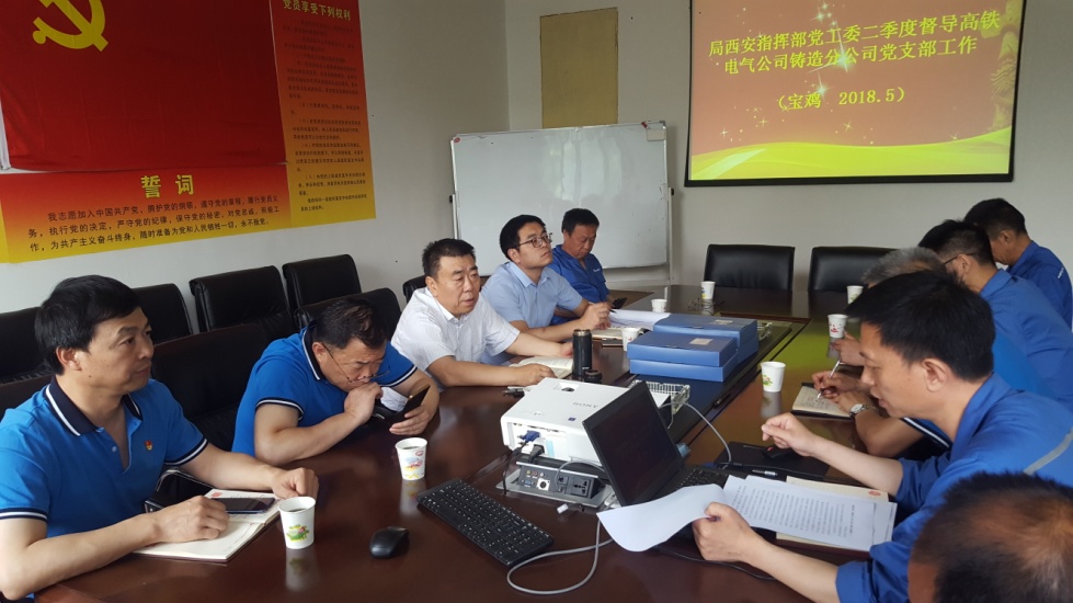 5月31日上午,局集团公司西安指挥部党工委史书记莅临铸造分公司,开展二季度党支部工作督导检查。公司党委书记赵戈红,副书记岳晋昌陪同检查,铸造分公司班子成员,低压党支部全体委员参加了此次督导检查会。